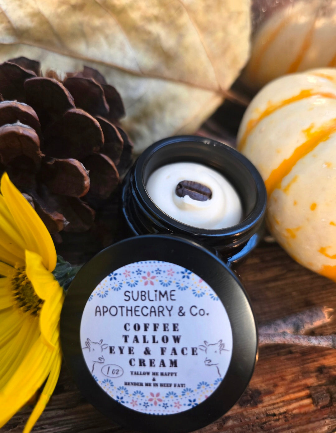 Experience the rejuvenating power of our Coffee Tallow Eye Cream, crafted to reduce dark circles, puffiness, and wrinkles. This 1 oz formula combines nourishing tallow and shea butter, ideal for the delicate eye area, with the invigorating benefits of Organic Fair Trade Coffee. Its natural, subtle aroma enhances your skincare routine while delivering targeted care for tired eyes. Perfect for those seeking a gentle yet effective solution to refresh and revitalize the skin around the eyes.